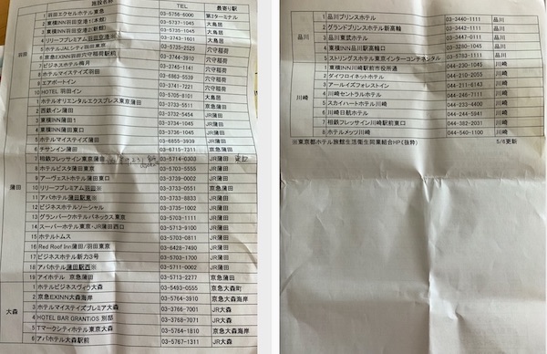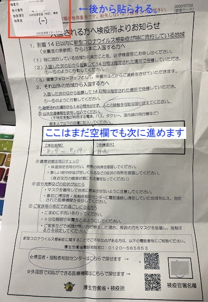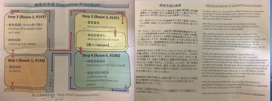 本帰国と日本の生活準備 2020/08/13 コロナ禍の本帰国3:羽田空港後編 時差ボケが治るのに時間がかかるようになってきたニイナです。前は太陽と同じ方向に進む移動は時差ボケもなかったのに、、、やはり年齢かしら。。。さて、羽田空港に着陸してから、の流れです。終わってみれば着陸からトータル2時間半での解放でした。が、到着して初めてわかることも多々ありましたので、その辺りを覚えている限りでお伝えできれば、と思います。(機内で配られる書類の画像などはこちら)着陸後10分もするかしないかで降りた羽田空港。降りて最初に誘導されたのは143番搭乗口で、そこが最初の待合場所でした。奥から順に座る場所を誘導されます。そこで飛行機を降りた全員が集まるのを待って、また新たに紙をもらって全員に向けてこれからの説明を受けます。機内でもらった書類にはこれらは機内で全て記入しておきなさい、と書いてありましたが、そこで書いている人も多くいました。 ↑もう半分ほど呼ばれていった頃。この時ここには同じJALのロスから到着した便の人だけがいたようです。小さなお子様連れのお母さんが何人かいらっしゃって、大変だろうな、、、と思うのですが、今時分は飛行機は席がガラガラで一人で4席一列を使えたり、周りに人が少ない席もあるので、ある意味普段よりは飛行機に乗せることだけを見た場合にはスムーズ、、、なのかもしれません。 ↑最初の待機場所で配布された説明書口頭での説明では、記載事項を全部埋めるまで解放されないとのことでした。ヤバい、早く今日のホテル取らなきゃ。。。でもホテル行くのにレンタカー今夜は怖いからええーとー、、、とまだどうするべきかわからないでいました。あ、因みにこの辺は全然写真撮るな、とかの規制はありませんでした。それと、この待合場所以降は唾液の採取が終わるまでは飲食一切禁止でした。ここでの待機は30分弱でしたでしょうか。(←うろ覚え)5人ずつくらい、奥の椅子に座った人(飛行機で前の方に座っていた人)から順に次の場所(142番搭乗口)に通されます。次の工程は検体採取でした。ここでもまだ最初の入り口で並んでいるところなどは写真撮影禁止などの注意はなかったです。一人の係員の人が機内でもらった書類の中の「入国される方へ検疫所よりお知らせ」を見ながら名前やこれからの14日間待機場所の確認などします。が、この時点で2週間の待機場所の内、シェアライドで福岡の自宅に帰る前までに滞在する1箇所目は今日から泊まるホテルがまだ決まっていないので記載していませんでした。2行目に自宅、と書いていたのでそれでokのようで、ここではあまり詳しく場所の確認はなくても次に進めました。この係員さんからは検尿の時に使うようなキャップ付きボトルをもらいます。それに貼る番号が印刷されたシール、別のシールを名前など確認した書類にも貼ってもらいます。 次の係員さんが一人一人に口頭で、唾液を容器に書かれてある線まで入れてください、入れるのに使った漏斗は捨ててください、という説明をします。これビデオとかですれば、このお姉さんも何十人(1日だと何百人?)に声を出し続けて同じ説明しなくて済むだろうに。。。とか思いながら。そこからは各自、選挙の投票所みたいに区切られたブースで壁に向かって容器に挿した漏斗に唾液を出して採取します。ここも本当は写真撮影禁止などは書かれてなかったんですけどね。。。なんとなく雰囲気でやめときました。その投票所みたいなブースに貼ってある説明だと2回唾液を出して、ということでしたがさっきのお姉さんの説明で言われた、ノルマの容器に書かれてある線までは全然足りないのでひたすら何度も壁に貼られたレモンと梅干しの写真を見ながら酸っぱい気持ちになって唾液を出しました。隣には一応、従来の鼻に長い綿棒を入れるPCR検査のブースも2〜3個ありそっちは写真撮影禁止と書かれていました。採取した唾液の容器にキャップをして、次の係員さんに指定された量が入っているかを確認されてから次のstep3に向かいます。ここは少し列が出来ていましたが、確認する窓口(係員さん)が7〜8人くらいいて、どんどん捌いているようです。ホテルがない!とかゴネている人も見受けられず、淡々とした雰囲気ではありました。自分の番が来て、質問票について確認されます。やはり質問票も今日のホテルが決まってないことで、滞在地の一箇所目を記入できていなかったのですが、あれ?なんかあまり深く突っ込まれない。。。なので自分から、「自宅に移動するまではホテルにいます。そのホテルまでは足がありませんのでどうしたら良いですか」と言いました。そこで「政府の周回バスが近隣の駅まで出ていますのでその駅近くのホテル一覧です」と周回バスが行く近辺ホテルの一覧をもらいました。ちなみに「駅までしか行きません」とも言われました。とりあえず周回バスが行く駅は分かったので待っている間