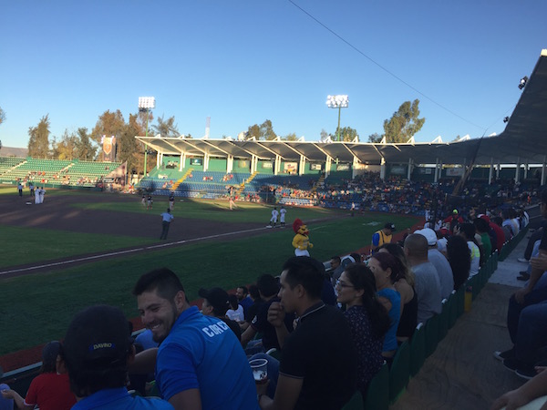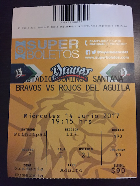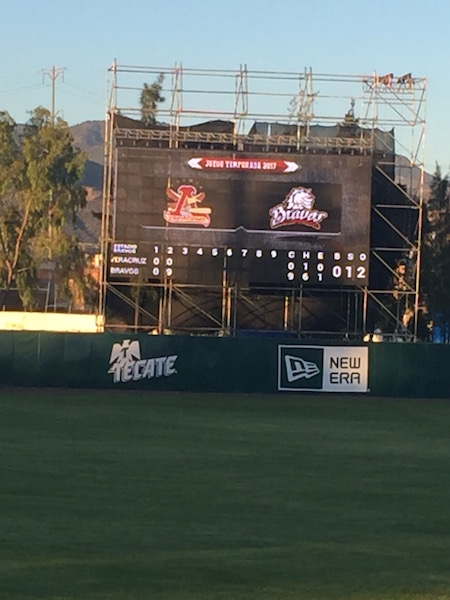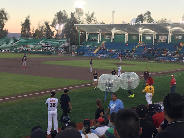メキシコの生活いろいろ 2017/06/18 いけいけゴーゴー!ブラボーズ!メキシコのプロ野球観戦。 明日からの仕事のやる気を引き出すために、ディズニーの名曲をエンドレスで聴いているニイナです。いや、元はスペ語の勉強のために、スペ語字幕のディズニー映画をyoutubeで探していたのですが。いい感じの教材が見つかる前に、結局こうなってるっていうね、てへぺろ。さて。先日、今年新設されたレオンのプロ野球チーム、ブラボーズのホームゲームを観に行ってきました。ご案内してくれたのは、今、日本から来ている会社の助っ人さんで日本では某プロ野球チームのスペイン語圏の選手の通訳をされている方です。そのおかげですっごく楽しい野球観戦となりました!でも、きっと普通に見に行っても楽しいと思います。なんてったって、このサッカーメインの国で、しかも超強豪チームをかかえるレオンという地に出来た新しい球団です。これから成長していく楽しみがあるのではないでしょうか。仕事の後に向かったスタジアムは、レオンのノルテ(北)エリアとセントロ(中央)エリアの間らへんと言えばいいでしょうか、サンタナ・ドミンゴ・ベースボール・スタジアム。すぐお隣にバスケットコートやテニスコートがあって、市民の運動広場として使われているようです。駐車場はそこと共用で16ペソくらいだったと思います。チケットは、外野の一番安いスタンドで一人90ペソ(540円くらい)。が、平日のホームゲームはキャンペーンで一枚分の値段で二人入れるので一人45ペソ。安い。。。他には内野側で300,400、500ペソといったVIPなお席もございました。今日の相手はベラクルスのチームです。 けっこうしっかり荷物検査もされて飲食物や危険物の持ち込みができないようになっています。が、中に入ると、同じ金額スタンド席ならシートのチェックがないので、みんな好きなところに座っています。(内野側のフィールドに近い所から埋まっている)中ではビールはもちろん、ペットボトルのソフトドリンク、ピザ(35〜40ペソ)やポップコーン、アイスなどのいろんな売り子さんが来ます。タコス屋さんなども敷地内にスタンドがありました。超絶大人気で供給が間に合わないチュロス屋さん。配達に来るたびに外野席の皆様からイジられていました(笑)球場の特徴としては、フィールドが近くてスタンドも高くなく、フェンスもないので投手の投げる球が速いのがよくわかります。もっと野球がメジャーなカリブの国々の選手やアメリカから来た選手もいるので体が大きいなぁ、、、というのもわかります。 あとは、日本でいうブルペン?あの、中継ぎとか抑えの投手が投球練習する所。あれが外野スタンドの目の前にあるので、これまたすぐ近くで選手が調整しているのが見れます。見れるだけでなくて、ファンサービスも行ってくれます。ボールを差し出したらサインしてくれたりとか。一番目の前に陣取っていた応援団長的なおばちゃんは選手が通りかかるたびに「今日何食べた?」とか話しかけていて選手もきさくに会話しているのです。いいなぁ、こういうの。 応援団長的おばちゃんの(お手製と思われる)レオン君をかぶらされて踊らされる通訳さん。。。こういう盛り上げ役、どこでもいるんだな。ただ、サッカーに比べるとまだまだマイナーなスポーツだからでしょうか。フィールドの壁に書かれたスポンサー名の少ないこと(汗) まだまだ空白が多い壁。日本人選手や某日本の大手の球団でプレイしていた人が入っている時期もあったりするので、こっちに進出している日系の会社の野球好きのお偉い方々!ぜひスポンサーになってレオンの、いやメキシコの野球界を盛り上げてください!(笑)球団のマスコットキャラクターが攻撃時に盛り上げるのはどこもいっしょなのかなぁ?レオン(ライオンっていう意味)なのでライオン君がマスコットです。 何回だったか忘れましたが、踊るわけでもない立ってるだけのチアガールも登場。・・・二人だけね。んもぅ〜、そんなに人手不足なら私、行こうか?!(要らんって) 試合は2回に9得点も入るなど、(荒い守備のおかげで)大量得点で盛り上がっていたのですが。 なんと。途中で電光掲示板のスコアボードが消えるし!それに合わせて音もなくなるから、一体今が何点入って、ってか何回なのかすらわからん(笑)観客のヤジも「オーディオ!」がメインでした(笑)そんなこんなでしたが、中継も入っていたようで、携帯でそれを見ながら観戦する人も。結局オーディオは壊れたまま、14対11で勝利した模様です(笑)やはり私がおごられチケットで行くと、勝つのよ。(ホークスの試合はタダでゲットのチケットの時は毎回勝利の女神でした)勝ち試合だからか、けっこう最後まで人は残っていましたと、いうわけで気持ち良い風が吹く野外で大きな声を出してストレスも発散。また行きたくなる野球観戦でした。(でもおごられチケットの時に勝つジンクスだから、誰かに連れて行ってもらわんとい