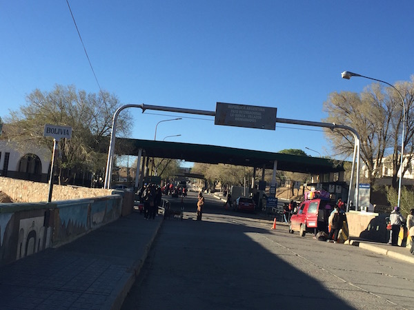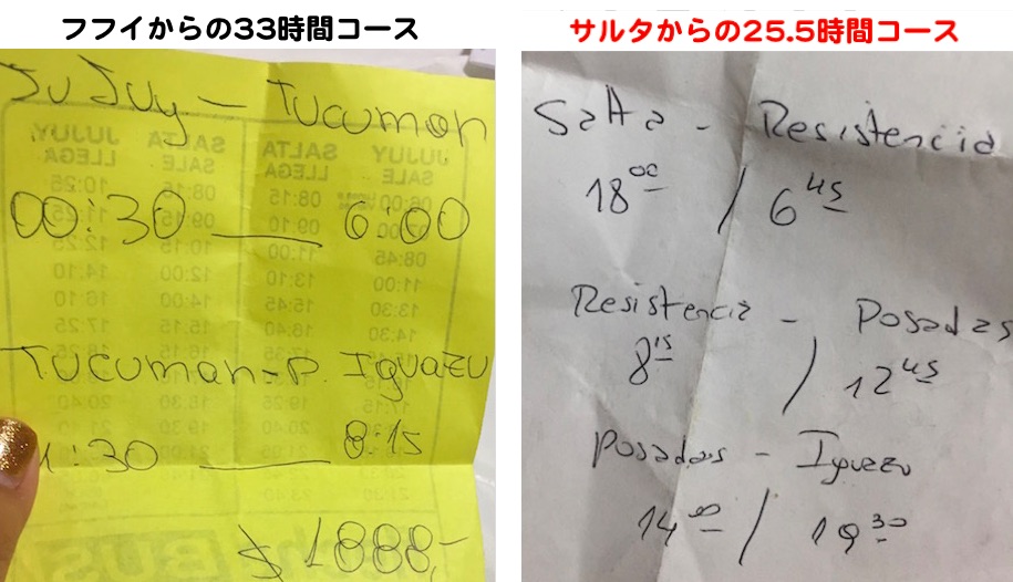 南米旅行 2016/10/13 夢のスタート的南米旅行:5.ウユニからイグアスの陸移動まとめ編。 砂漠の朝、極寒の空港にて一部暖房器具があるのがセキュリティチェックの所で、チェック終わったあともなんとかそこに留まれないかな、としてみたニイナです。邪魔者(笑) ウユニから国境の町ヴィジャソンに向かう間に朝がきましたさて。ウユニから、長年行きたかったイグアスに行くべく移動の部分なんですが。ウユニ⇄イグアス間の移動の計画には本当に困らされたので、覚書として実際の私の動いたものを残しておきます。なんで困ったって、飛行機を使っても遠く離れた経由地に行ったり、毎日は便が無かったりでうまいことルートが組めないのです。で、陸路となるわけですが、旅の先人たちのルートを大きく分けて三つ。① ボリビアのサンタクルスまで北上→バスでパラグアイ入国 →ブラジル側またはアルゼンチン側のイグアスの滝へ② ボリビアとアルゼンチンとのいずれかの国境を越えてアルゼンチン入国 →バスでアルゼンチンだけを通り、アルゼンチン側のイグアスの滝へ③ ボリビアのウユニからチリのアタカマ砂漠へバスかツアーで抜ける →チリからアルゼンチンのサルタへバスで入国して、②と同じくアルゼンチンを通ってイグアスの滝へ ①は安いけど、すごい悪路を通るのと、24時間とも36時間とも言われる、不正確さが売り(?)なのでパス。②、③で最後の最後まで悩んだのですが、今回はイグアスのあとにまたペルーやチリ側に戻ってくる予定が入っていたので、何度もチリ入国をしたくないってことで、②に決定。前回書いた通り、ボリビア側の国境の町のビジャソンまでは運良くその日に列車があったのでたどり着けました。 ここでも結構な高さありましたね。3400mってさ。問題は、アルゼンチンの中をいかに早くイグアスまで抜けるか、です。ビジャソンでは駅からタクシーで10分ほどの国境へ。金額忘れましたが、そんな高くは無かったと記臆しています。歩いて行ってる人もいたんじゃないかな。国境は24時間オープンだったと思いますが、窓口一個で対応しているので、けっこう並びます。 ボリビア側 ボリビア側とアルゼンチン側に1時間の時差があります。で、どっちのかわからんけど(おそらくアルゼンチン側)朝8:00にアルゼンチンの国旗掲揚がありました。ボリビア出国窓口の隣でアルゼンチン入国窓口でスタンプok。アルゼンチンに入るのに、通関は健康診断で使うような?車に備え付けられたX線検査機械の1mくらいのベルトにぴゅっと通すだけでした。マテ茶(コカの葉)に対しては厳しいとか聞いていたけど全くそんなこともなく。その先のアルゼンチン領では国境の町はラ・キアカという町です。 最後は行くことになるかな。。。?パタゴニアのアルゼンチン側の最果ての地までむっちゃ遠い。。。人に道を聞きながらセントロまで歩いて15分くらいでした。バスターミナル付近では、フフイ、またはサルタ、という街までの客引き合戦がすごいです。最終的にサルタという街まで通しで買えば安く済んだのですが、この時は何も情報がなかったので、とりあえず早く行けるフフイまでのチケットを購入。 使ったのはここ、エル キアケーニョ社。単純に時間が一番早かっただけなんですけど。ちなみにアルゼンチンのこの地方ではどこのバス会社もそうなのかわかりませんが、15キロまでの荷物を預けることができるとチケットにも書いているくせに、 預けるなら10ペソ払え、と言ってきます。じゃあ、目の届かなくなるところに預けたくもないし、座席の足元広い所に置くからいいよ、と言ったら、持ち込みはダメだからタダで預かってやる、と。その代わり乗る時も降りる時もチップを要求してきます。こういうところがなぁ。。。ラ・キアカからフフイ、サルタに抜ける間はウマワカ渓谷という所を抜けます。バスから見える景色は、乾いた高地から、だんだんと標高の低い緑豊かなものへと変化していきます。動物もリャマ殿達から、牛馬へ。。。 ここらへんのエンパナーダは小ちゃい。で、到着したフフイの街のバスターミナルで何社か確認したら、イグアスに行く便はあるにはあるのですが、深夜に出てサルタより少し南のトクメンというところで乗り換えてイグアスに行く、というものでした。(それも毎日は出てない会社もある)そのルートを使った場合、乗り換え時間も含め最低32時間はかかります。うわぉ。乗った翌々日の到着は、日程に余裕がない私には厳しい。地球の歩き方などにも書いてあるルートだと思うのですが、夜中まで暇だなというのと、乗り換え地での時間のロスが無駄に思えること、それと地図上では少し遠回りになることがどうしても気になって。そこでフフイより大きなサルタの街へ。ここは空港もあるので、最悪バスがなくても、運良く飛行機があってそれに高いお金を出せばフレキシブルに動けます。で、サルタの街のバスターミナルで確認した1社目で、こ