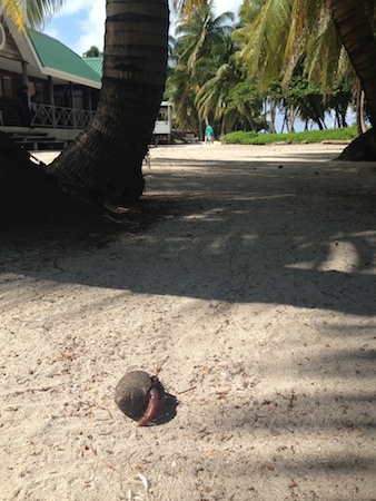 ベリーズ 2014/11/11 ベリーズ逃避行:海とマナティと私。 とは言ってみたもののマナティ会えてないんですけどね、のっけから暴露するニイナです。 海も、、、すみません、言うほど写真は無いです。 いや、だって期待持たせてあえませんでした、じゃ、ねぇ・・・? キーカーカーにて3カ所巡りツアーに申し込んで、ツアー当日朝朝食を食べてのんびり散歩したりして。 ↓頭上に落ちたらどうなるか、と心配なヤシの実 10:15きっかりにツアー会社のお庭に水着+パーカーと貴重品はどうしたもんかと思って(途中で何のオプションがあるか分からん、と。)結局ポーチにカメラや携帯と共に持参して集合しました。 実はこの歳にして人生初のシュノーケリングです。 ツアー会社のお兄さんに私にちょうど合うフィンとマスクを選んでもらっていたりして、ちょうど出発予定の10:30きっかりに、強面ドレッドおじさんが行くぞ!と。 どうやら今日のガイドさんは見た目に合わずキッチリとした感じの方みたいです。 その日の参加者は私以外に一人の20代アジア系男子と、40前後かな?アジア系奥さん連れのカナディアン夫妻の計4人。 出発進行!したところでアジア系奥さんが自己紹介してきました。 流れでアジア系男子と私も英語で(くっ!またもここで英語か!)自己紹介・・・しようとしたらなんとその男子、ビックリなことにケツァルテナンゴからちょろりときた、福岡(と言いつつ実は佐賀)出身という、私となんだか現況が似ている日本人でした(笑) いや、最初見た時から日本人だろうなーとは思ったんですが、(というか華僑以外のアジアンにほぼ出会わない)日本人と関わりたがらない人も多いし、何より私が引っ込み思案なので(笑)話しかけずにいたのです。 空は快晴とはいかずとも、当分降る気配はなく、ボートが水面に叩き付けられる振動も楽しい程度です。 カナディアン夫妻は2台のカメラを駆使して忙しく自分たちの写真やビデオを大量に撮りまくっています。(ビデオに何でもかんでも収めるのを世界中の観光地でやってるのは大概アメリカ人かカナダ人ですよね。韓国人はポーズをつけた自分写真が好き。) ガイドのおじさんは時にボートの体重バランスやロープさばきで忙しそうにしつつ、無口ながらも今日のポイントや注意点を英語で説明しながら(私はそれを佐賀男君に訳してもらってやっとこさ理解しつつ)順調に最初のポイントに向かってボートは1時間弱(?位だと思うのですが)走りました。 最初のポイントに到着しました。透明な水面の下に白い砂の海底が見える深さです。 水温は全く冷たくなく、かといって温くもなく、本当に適温です。 シュノーケリングをなめてかかってガイドさんに「私、ライフジャケットいらないよ!泳げるもん!」と言っていよいよ海ポチャしてボートから20mくらい離れた所までガイドさんについて泳ぎました。 ボートの上で練習したつもりでしたが、口から息を吐くのは出来てもなかなか吸い込めず、呼吸の度に顔を出し、シュノーケリングしてない私。 ついにガイドさんからボートに戻ってライフジャケット着用命令が出ました(笑) そうしてライフジャケットを着けて再度トライ! 口だけ呼吸も少しずつ慣れてきました。 そうして見る世界は。。。本当に素晴らしく美しく、写真を撮れなかったのが残念です。 ただ、写真はある程度思い出に残せるのですが、海の中に限らず世界中の絶景はそこに行って見たそのままを写真には残せないと毎度痛感します。 その場の空気感を現せないのは当然なので仕方ないのですが、絶景と言われる場所じゃなくても、きれいな夕日や海の色の違いなど、色に関してはやっぱり人間の目に敵うものは無いな、と。 だから心のシャッターを切って、自分だけの心のアルバムに残すしかないんですよね。 自分が死ぬ時にそのアルバムが分厚過ぎて走馬灯が長くなって死ぬまでの時間を延ばしてちょっと得した気分になろう!と勝手な想像を繰り広げている私です。 ガイドさんが小さな魚(多分これは準備していた)を大きな巻貝の中に詰め込んで餌にして、魚とウツボをおびき寄せてくれたり、小さなサメを捕まえて抱っこさせてくれたり。 他にも2カ所回って、きれいなたくさんの種類の魚やウミガメやエイに会えて、素晴らしい珊瑚礁の世界をたくさん見る事が出来、大満足でした。 最後のポイントでマナティに運が良ければ会えるかも。。。でしたが残念!でも帰りにイルカに出会えました! 因みに他のボートはイルカと泳げるのがウリだったかどうか分かりませんが、イルカの群れを見つけて次々に乗客が海に飛び込んでいました。が、イルカって泳ぐの早い。。。当然乗客達は置いて行かれ、結局船に戻る、という間抜けな光景に笑えました。 この日に行ったホール・チャン海洋保護区他、ベリーズバリアリーフはオーストラリアのグレートバリアリーフに次ぐ世界第二位の珊瑚の群生地です。 はぁ〜、こんなきれいな所で泳げてもうどうしよ。次はオー
